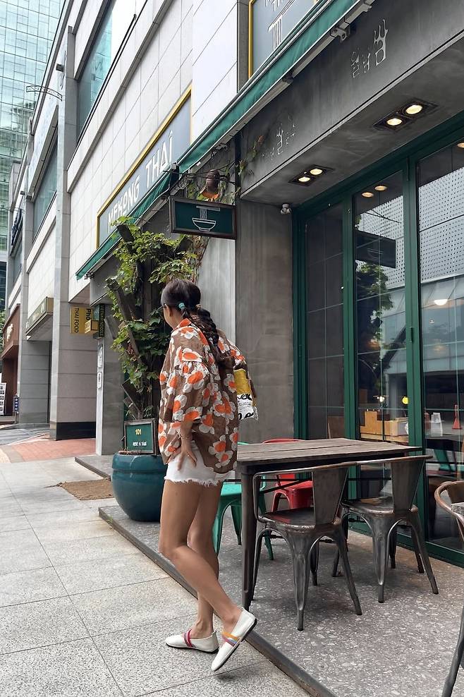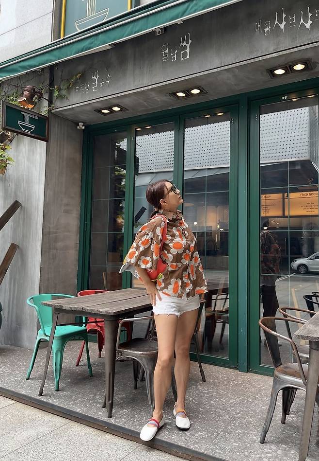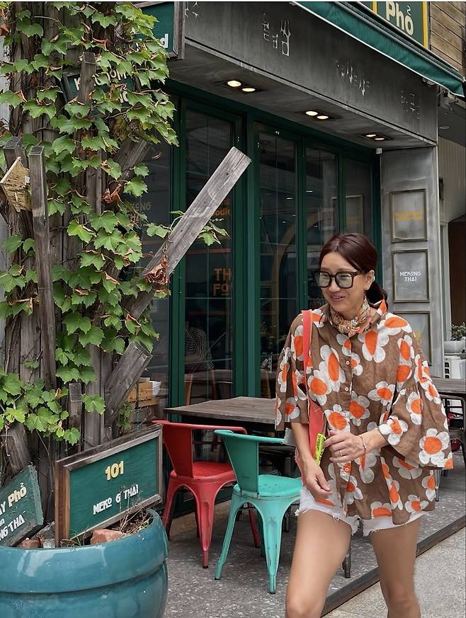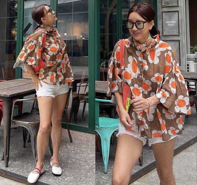 윤현숙은 오버사이즈의 플라워 패턴 셔츠로 시선을 사로잡는 스타일을 연출했습니다.