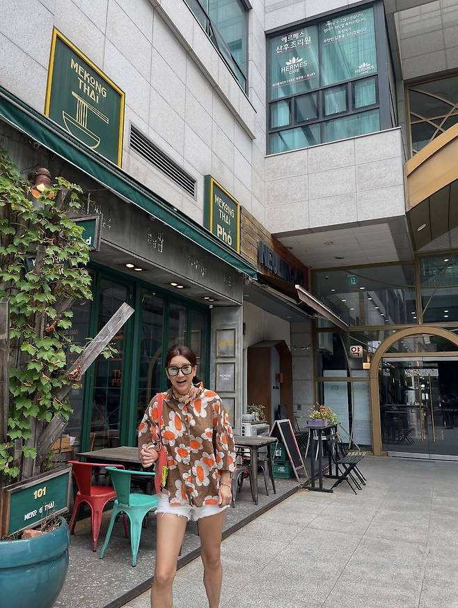 윤현숙은 오버사이즈의 플라워 패턴 셔츠로 시선을 사로잡는 스타일을 연출했습니다.