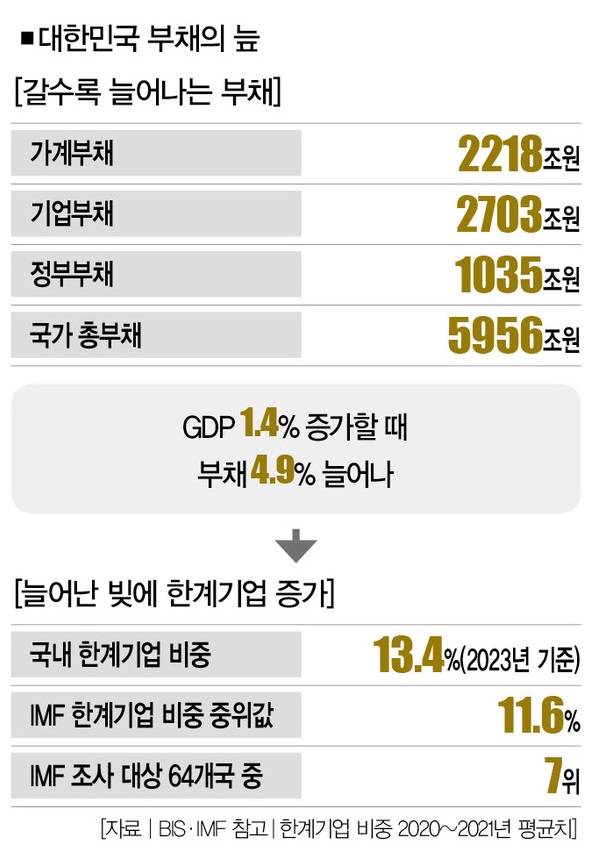 국제결제은행(BIS)이 집계한 우리나라 국가총부채(비금융부문 신용)는 지난해 2분기 말 기준으로 가계부채가 2218조원, 기업부채가 2703조원, 정부부채가 1035조원으로 총 5956조원이다. 국가총부채는 1년 전보다 4.9% 늘었지만, 우리나라 GDP는 지난해 1.4% 증가하는데 그쳤다.