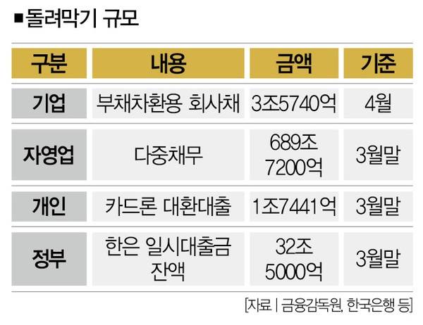정부도 일종의 빚 돌려막기에 나섰다. 양경숙 의원이 지난 4월 14일 공개한 한국은행의 대對정부 일시대출금 내역을 보면, 정부는 올해 1~3월 한은에서 45조1000억원을 빌렸지만, 32조5000억원을 못 갚았다.