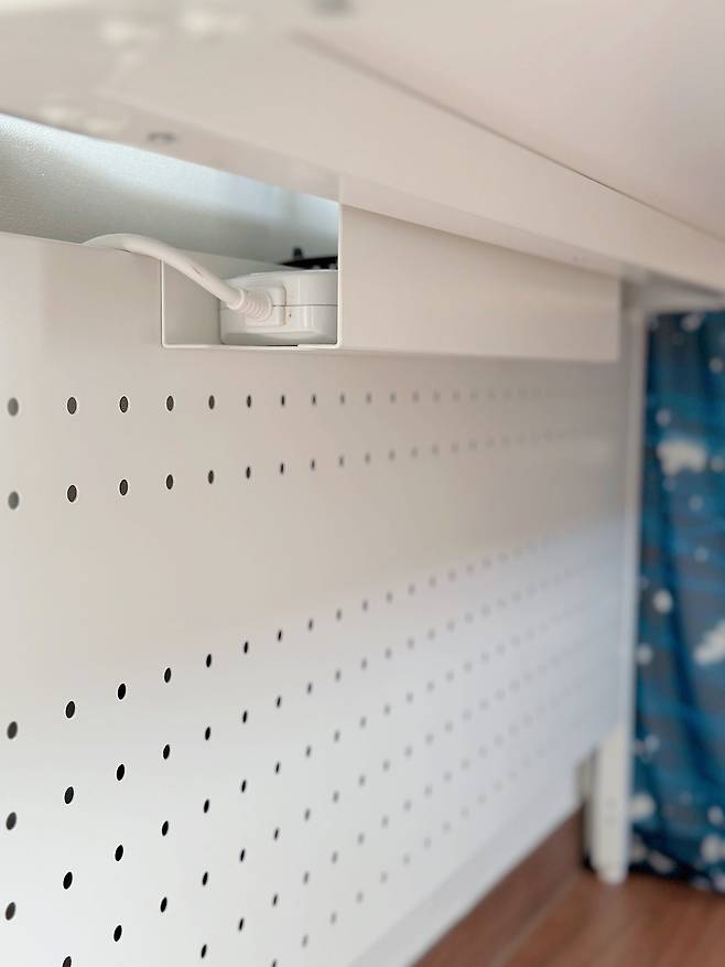 만족스러운 건 기본으로 일체형 타공판이 제공된다는 거예요. 저는 타공판을 책상 뒷면 아래쪽에 설치해서 와이파이 공유기와 전선들을 가려주었어요. 상부 선반이 있는 타워 타입의 경우 책상 위에 타공판을 설치해서 타공판 홀더 및 자석을 이용해서 자유롭게 스타일링할 수도 있어요. 저는 다양하게 활용할 수 있는 제품을 선호하는데, 이 책상은 다양한 스타일로 커스텀할 수 있을 것 같아 아주 만족스러워요.