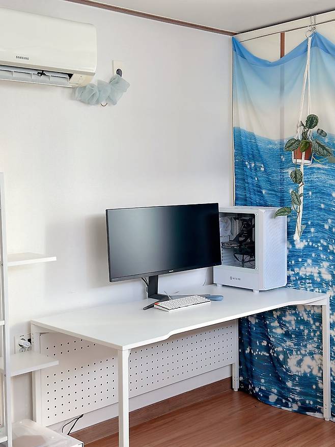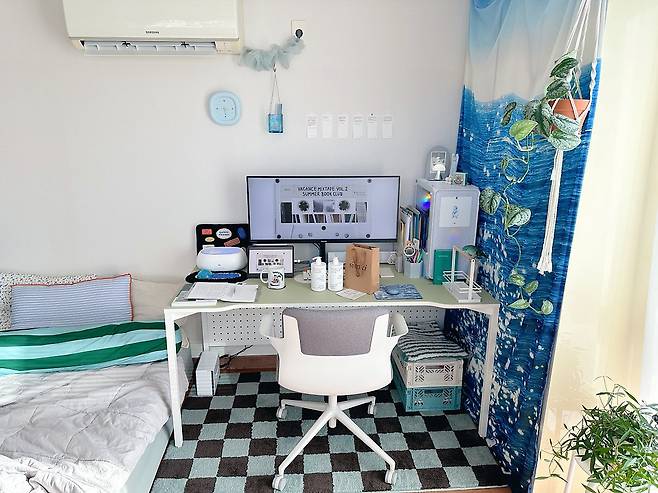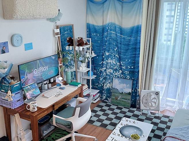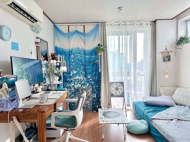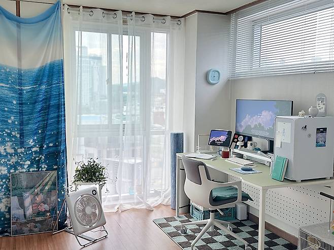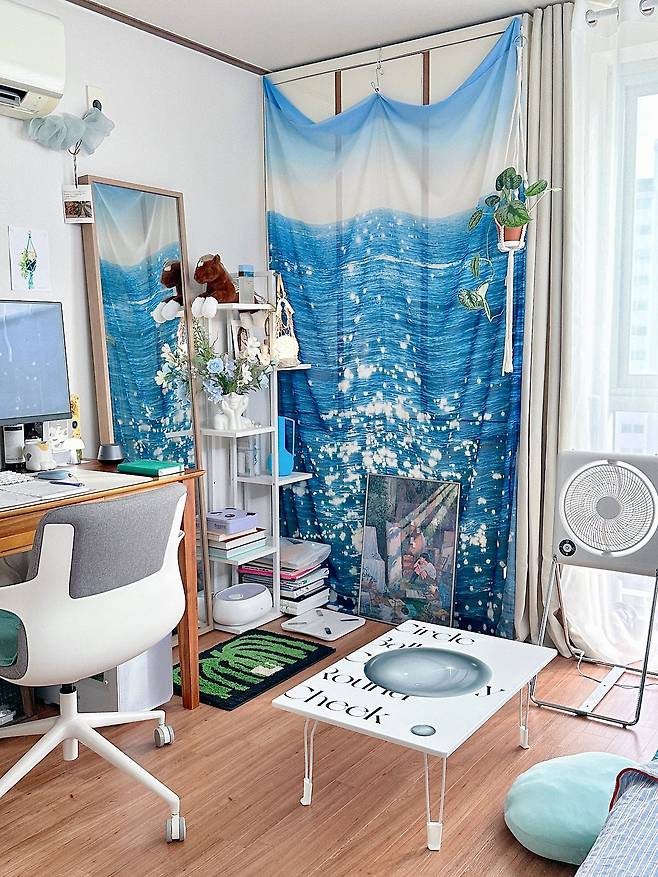 처음 인스타그램 등에서 관심을 받은 건 패브릭 커튼을 활용해, 시원 청량한 분위기가 나는 집 사진 덕분이었어요. 사실 이 커튼은 '데코뷰'라는 브랜드에서 진행하던 이벤트에 운 좋게 당첨되어 받은 경품인데요. 안에 에어컨 실외기가 설치되어 있는 붙박이장을 가리기에 정말 안성맞춤이어서 지금까지도 계속 애용하고 있답니다. 보기 싫은 곳을 가릴 수도 있고, 반짝반짝 바다 위의 윤슬이 눈에 띄는 커튼 프린팅 덕분에 시원하고 청량한 분위기가 나서 추천하고 싶어요.