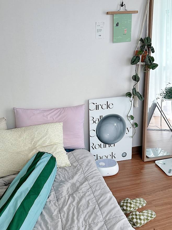저는 평소에 가구 배치를 옮기는 것을 좋아해요. 특히 계절에 따라 전체적인 구성을 바꾸어주는데요. 이번에는 책상을 창문 근처에 배치해 보았습니다. 창문으로 찬 바람이 들어오기 때문에 침대는 안쪽에 두었고요. 책상을 창문 근처에 두니 일하는 중간중간 창밖 풍경을 바라볼 수 있어서 만족스러워요.