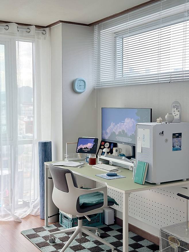저희 집 인테리어의 컨셉은 시원하고 청량한 분위기의 블루 그린 스타일이에요. 화이트 계열의 가구를 주로 사용하고, 블루 그린 컬러로 포인트를 주었습니다. 공간에서는 특히 윤슬 패브릭 커튼이 큰 역할을 해주고 있는데요. 기존 마루가 어두운색이라 아쉽지만 부분 부분에 러그를 깔아 보완해 보았습니다. 업무 공간에는 민트 초코 체커보드 패턴의 카펫을 깔아 구분해 주었어요.