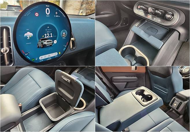 이와 함께 실내에서 독특한 부분은 1열 콘솔박스다. 일반적으로 콘솔박스는 1열 좌우 시트 등받이 사이에 설치하지만 컵홀더 뒷부분에 별도의 수납박스(미니박스)를 마련했다. 수납박스에는 MINI 글자가 새겨진 덮개가 존재해 다양한 소지품이나 작은 물건을 보관하기에 용이하다. 별도의 콘솔박스를 만든 만큼 1열 시트 등받이 사이에 있는 팔걸이(암레스트)는 앞뒤로 조절할 수 있도록 만들어 운전자의 사용 편의성을 높였다.