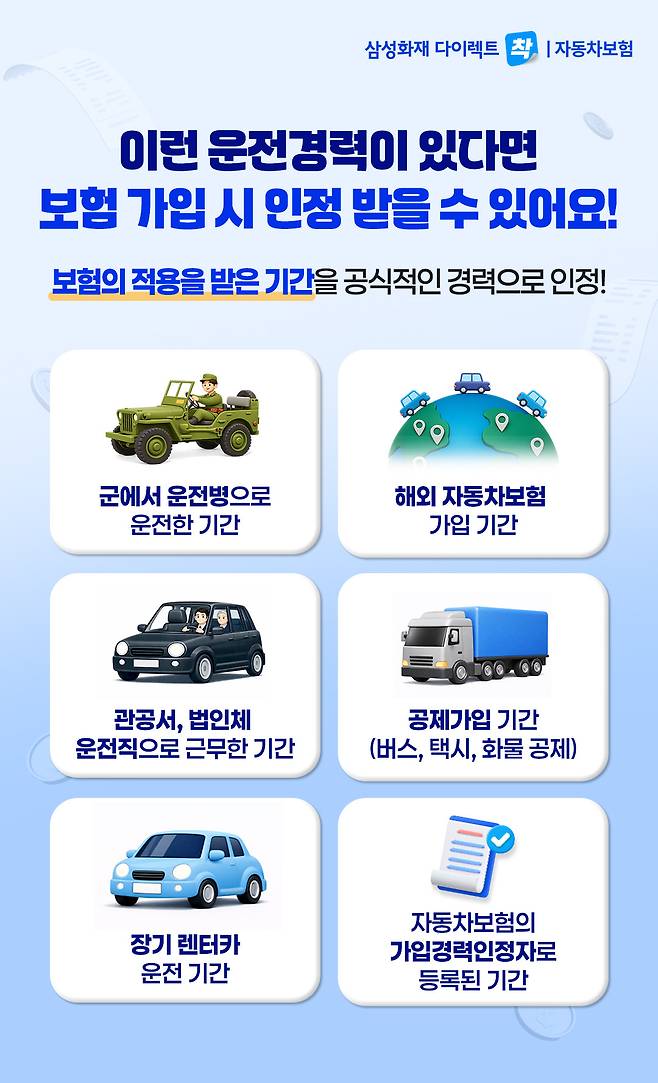하지만 군 복무, 해외 자동차보험 가입, 법인 차량 운전 등 과거 운전경력이 있다면 이를 보험가입 경력으로 인정받아 보험료 부담을 낮출 수 있습니다.