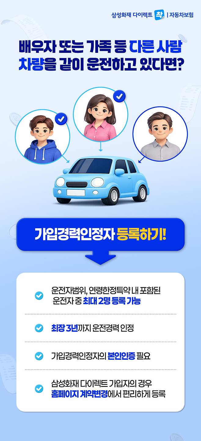 A. 단순 운전자 추가와 가입경력 인정자 등록은 다릅니다. 추후 본인 명의 자동차보험 가입 시 보험료 절감을 위해서는 반드시 '가입경력 인정자'로 등록되어 있어야 하니 반드시 확인해보세요.