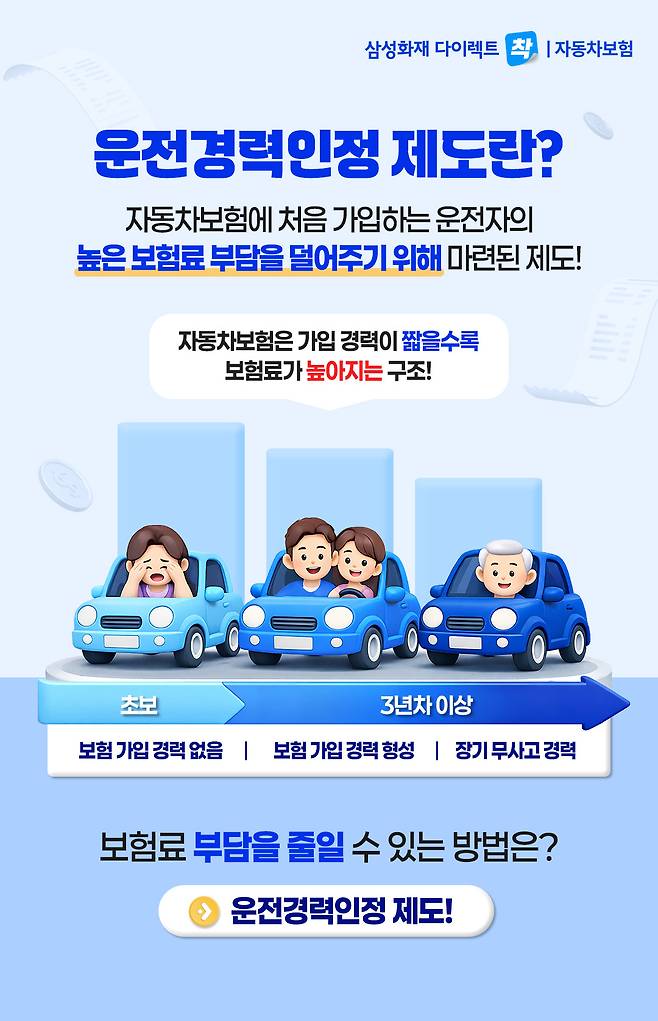자동차보험은 가입 경력에 따라 보험료가 달라지며 경력이 쌓일수록 일정 수준까지 보험료가 낮아지는 구조입니다. (최대 약 3년 반영) 보험 가입 이력이 없는 경우에는 사고 이력 등을 확인하기 어려워 초기 보험료가 상대적으로 높게 책정될 수 있습니다.