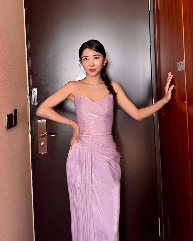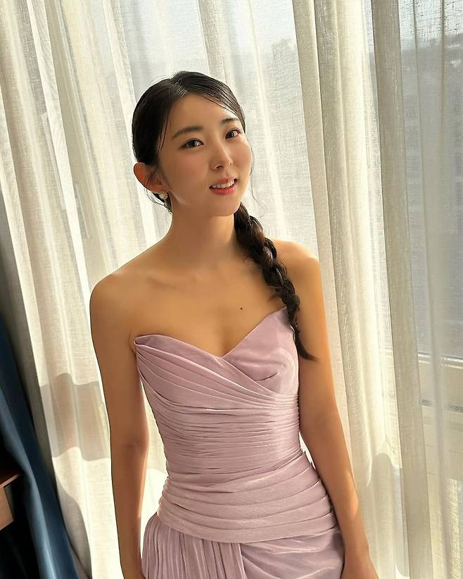 특히 그녀의 헤어스타일 역시 드레스와 조화를 이루며 전체 스타일을 완성하고 있다. 한쪽으로 길게 땋은 브레이드 헤어는 고전적인 아름다움과 현대적인 단정함을 동시에 보여주며, 화려하지 않지만 정제된 미를 강조한다. 메이크업 역시 내추럴 톤으로 깔끔하게 마무리돼 그녀 특유의 청순한 인상을 더욱 강조했다.