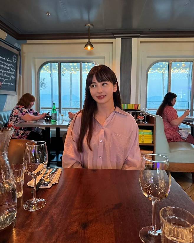 구잘이 로얄 캐리비안 크루즈에서의 특별한 디너룩을 공개하며 패셔니스타 면모를 드러냈다. 이탈리안 레스토랑 Jamie’s Italian을 배경으로 한 이번 스타일은 그녀의 감각적인 패션 센스를 한눈에 보여준다. 따뜻한 조명 아래 빛나는 라벤더 컬러 셔츠와 블랙 미니 플리츠 스커트의 조합은 단정하면서도 로맨틱한 분위기를 완성했다.
