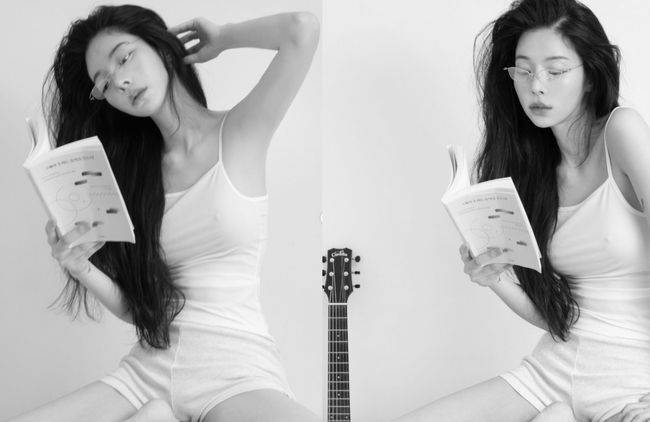 특히 그는 '노브라' 콘셉트를 소화하며 집에서 자다가 일어난 듯한 있는 그대로의 면모를 강조했다. 한 손에 책을 들고, 옆에 기타를 세워둔 모습이 흑백사진으로 어우러져 아티스트의 면모로 파격적인 콘셉트와 조화를 이뤘다.