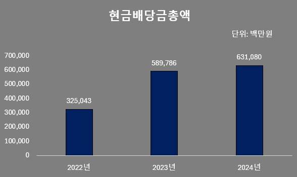 2024회계연도 기준 포스코의 주당배당금이 6541원으로 전년도의 6113원보다 428원 증가했다. 배당금은 법인의 순이익에서 지급된다. 포스코의 지난해 연결기준 순이익은 1조787억원으로 전년(1조4222억원) 대비 감소했다. 별도 재무제표 기준상 순이익은 24% 줄어든 9015억원을 기록했다. 그러나 포스코는 부침을 겪는 와중에도 오히려 배당을 더 했다. 곳간이 아직 마르지 않았기 때문이다.