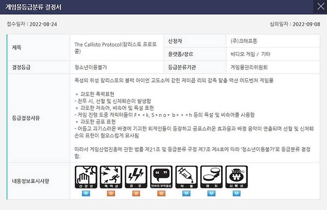 20일 <블로터> 취재 결과 크래프톤이 지난 8일 게임물관리위원회(이하 게임위)로부터 칼리스토 프로토콜에 대한 등급 분류를 받았다. 게임위는 칼리스토 프로토콜에 대해 "어둡고 괴기스러운 배경에 기괴한 외계인들이 등장하고 공포스러운 효과음과 배경 음악이 연출되며 선혈 및 신체훼손의 표현이 혐오스럽게 묘사된다"며 '청소년이용불가' 등급을 결정했다.