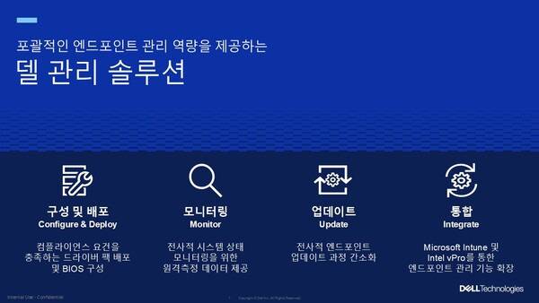 델의 시스템 관리는 △설정 및 배포 △모니터링 △업데이트 △통합 등 총 4단계에 걸쳐 이뤄진다. '설정 및 배포' 단계에서는 IT 관리자가 BIOS 및 하드웨어를 설정할 수 있는 '델 커맨드 | 구성(Dell Command | Configure)'과 마이크로소프트 인튠(Microsoft Intune)을 연동해 클라우드에서 델 PC를 손쉽게 관리할 수 있는 '델 관리 포털(Dell Management Portal)'을 제공한다. 마이크로소프트 인튠은 클라우드 기반의 모바일 디바이스 및 애플리케이션 관리 솔루션이다. 기업이 다양한 사용자 기기를 원격에서 등록하고 설정하며 보안 정책을 적용할 수 있도록 돕는다. 델 관리 포털은 클라우드에서 델 PC를 원격으로 관리할 수 있도록 지원하는 델의 전용 포털로 마이크로소프트 인튠에서 활성화할 수 있다.