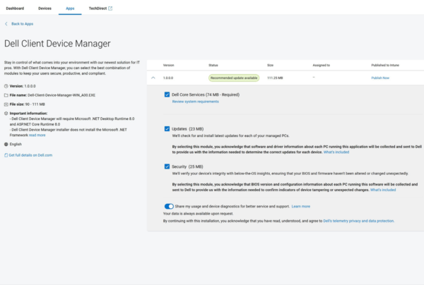 업데이트 단계에서는 시스템 업데이트 과정을 간소화한 단일 애플리케이션인 '델 클라이언트 디바이스 매니저(Dell Client Device Manager)'를 제공한다. 이는 관리자가 여러 대의 델 PC를 원격으로 손쉽게 관리하고 필요한 보안 업데이트나 기능을 빠르게 배포할 수 있도록 돕는 솔루션이다.