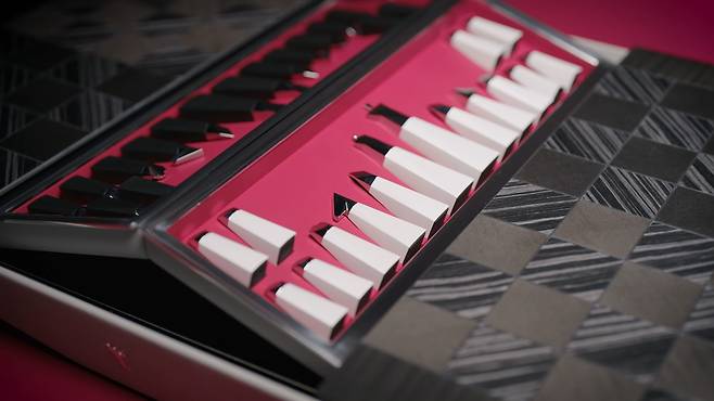 하단 받침대는 세라믹 코팅 처리된 알루미늄으로 제작되며, 체스말을 수납하는 내부 공간은 원목과 금속, 가죽 소재가 조화롭게 결합되어 있다. 체스말은 금속 소재로 제작되었으며, 그 형태는 롤스로이스 차량의 송풍구 조절 다이얼을 연상시키는 정교한 디테일을 자랑한다. 검은색 말은 무광, 흰색 말은 유광 처리되어 서로 뚜렷한 대비감을 형성한다. 또한 체스판 내부에는 자석이 내장되어 있어, 체스말을 판 위에 안정적으로 정렬할 수 있도록 설계되었다.