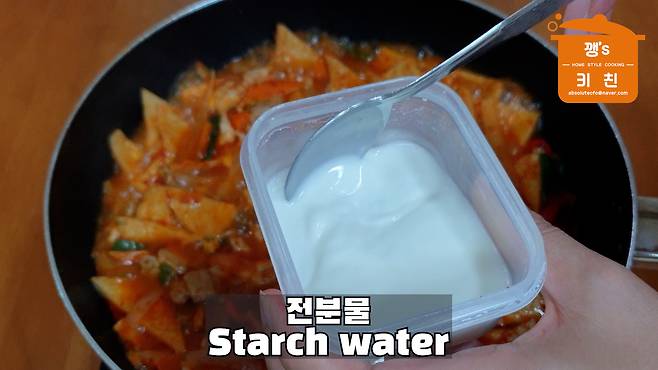 전분가루와 물을 1:1 비율로 섞어 만든 전분물을 넣고 끓여 농도를 더해주세요