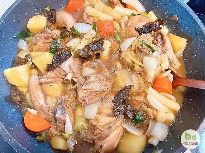 → 냄비에 닭과 양념, 감자·당근·떡을 넣고 중불에서 20분간 끓인다.