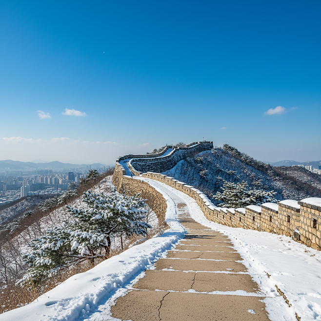특히 수어장대를 향하는 길은 경사가 완만하여, 겨울철에도 미끄러질 걱정 없이 눈 쌓인 풍경을 감상하며 여유롭게 산책을 즐기기 참 좋습니다.