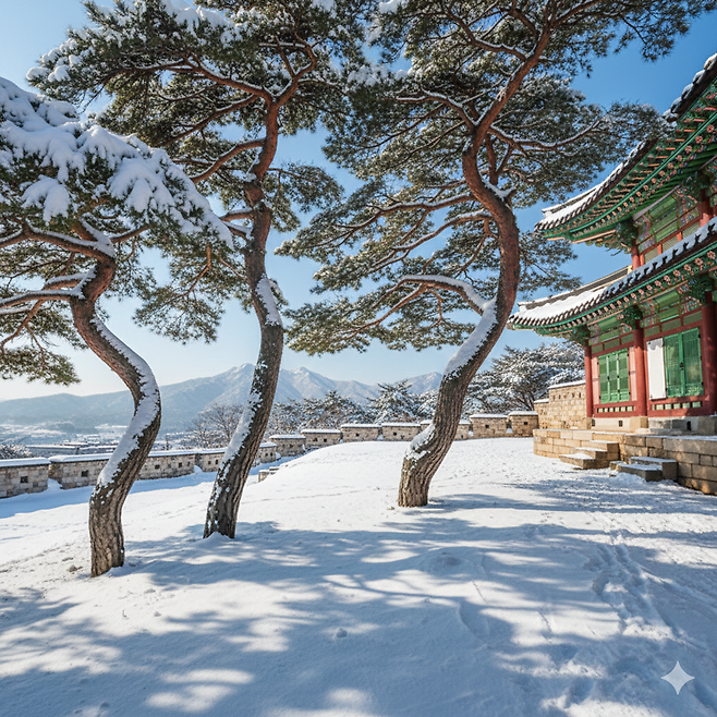 남한산성은 사계절 내내 아름답지만, 특히 하얀 눈이 소복이 쌓인 겨울날의 풍경은 그야말로 절경입니다. 견고한 성벽 위에 내려앉은 눈송이들은 고색창연한 성곽을 더욱 신비롭게 만들죠.