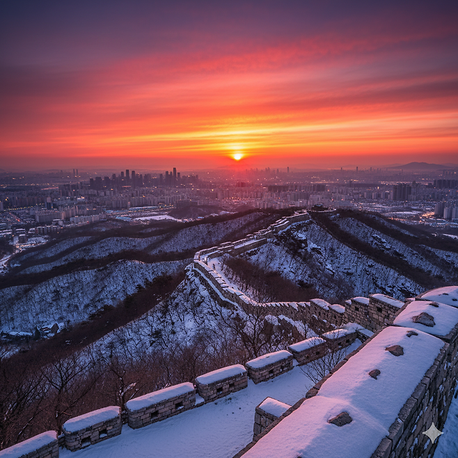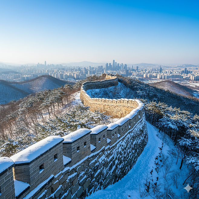 수어장대에 오르면 그야말로 탄성이 절로 나오는 파노라마 뷰가 펼쳐집니다. 하얀 눈을 머리에 이고 있는 산줄기들과 그 아래로 펼쳐지는 서울 도심의 풍경은 겨울이 선사하는 가장 아름다운 선물이죠.