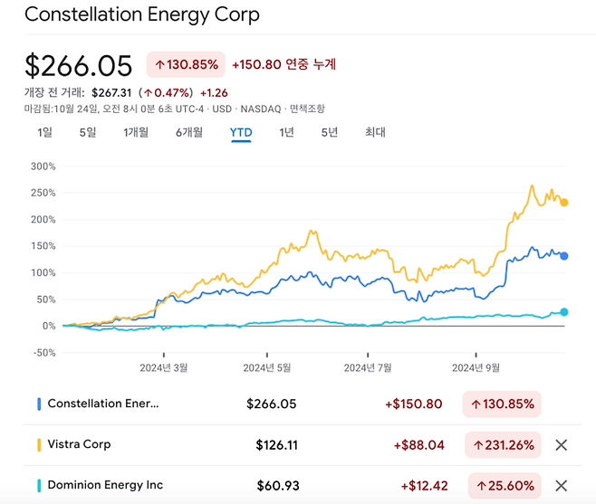 3. 미국 주요 에너지 기업 주가에는 원자력 에너지에 대한 기대감이 반영돼 있는 상태입니다. 콘스텔레이션 주가는 올해 들어 약 130% 올랐고 이후 약 80% 오른 상태였는데, 이후에도 상승세를 이어갔습니다. 전문가들은 미국 빅테크기업까지 원전 기업에 대한 관심을 보이면서 원전주의 추가 상승 여력이 있을 것으로 보고 있습니다.