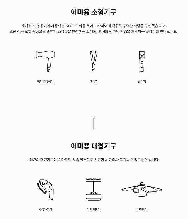 JMW는 2004년에 설립되어 20년 차에 접어든 중견기업입니다. ‘지속적인 연구·개발과 기술혁신을 통해 이미용 산업의 발전을 이끄는 것’이 JMW의 브랜드 미션이죠. 주력 제품은 헤어드라이어·고데기 등의 미용 소형 가전과 헤어샵에서 주로 쓰는 디지털펌기·세팅펌기 등의 미용 대형 가전, 그리고 샴푸·컨디셔너·컬 크림과 같은 헤어케어 제품입니다. ‘헤어’ 하나에 집중해서 찬찬히 제품군을 넓혀왔죠.
