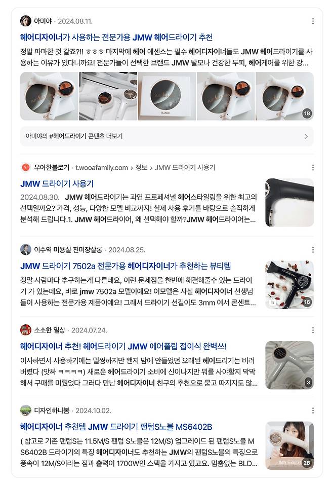 헤어 디자이너 커뮤니티 ‘헤어쟁이들의 좋은 만남’에서는 헤어드라이어 추천 부탁 글에 JMW 헤어드라이어를 추천하는 댓글을 발견할 수 있습니다.