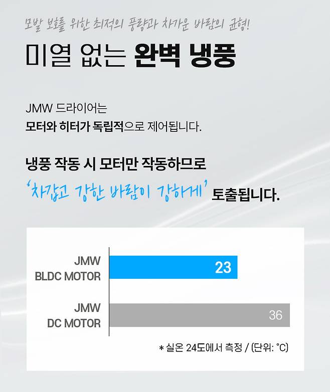 JMW는 BLDC 모터를 기반으로 고객의 불편을 하나씩 해결해 갔습니다. 첫째가 바로 ‘완벽 냉풍’입니다. 대부분의 헤어드라이어는 ‘완벽 냉풍’을 구현하지 못했습니다. 모터와 히터가 독립되지 않았기 때문이죠. 그래서 냉풍 모드에서는 약간의 온풍이 섞일 수밖에 없었습니다.