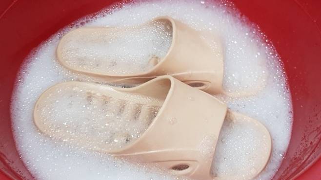 이제 더러운 욕실화를 이곳에 담가 주세요. 대략 30분 정도 그대로 두기만 하면 끝이에요.
