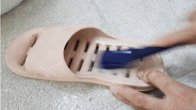 시간이 지나면 욕실화가 충분히 불어나 닦기 쉬운 상태가 되는데요. 받아 놓은 세제물을 이용해 솔로 깨끗이 문질러 주세요. 그냥 문지르는 것만으로도 묵은 곰팡이나 물때가 아주 쉽게 제거된답니다.