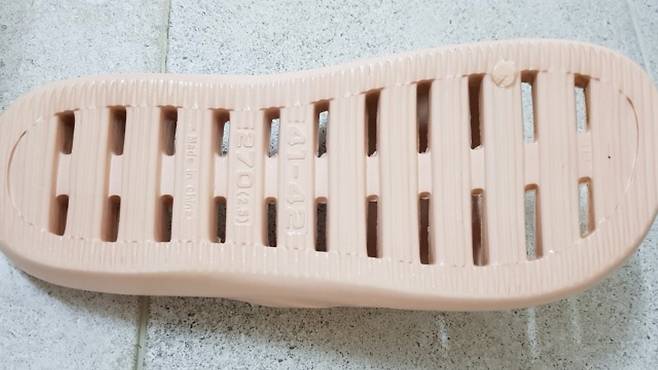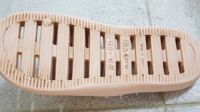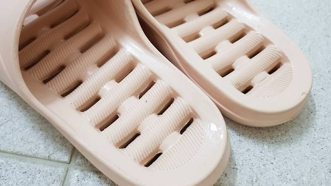 이것은 저희 집에서 사용하고 있는 욕실 슬리퍼예요. 보시면 미끄러지지 않게끔 사이사이에 홈이 정말 많이 있는데요. 문제는 이곳에 물때 곰팡이가 이렇게 껴서 사용할 때 위생상 좋지 않다는 점이에요!