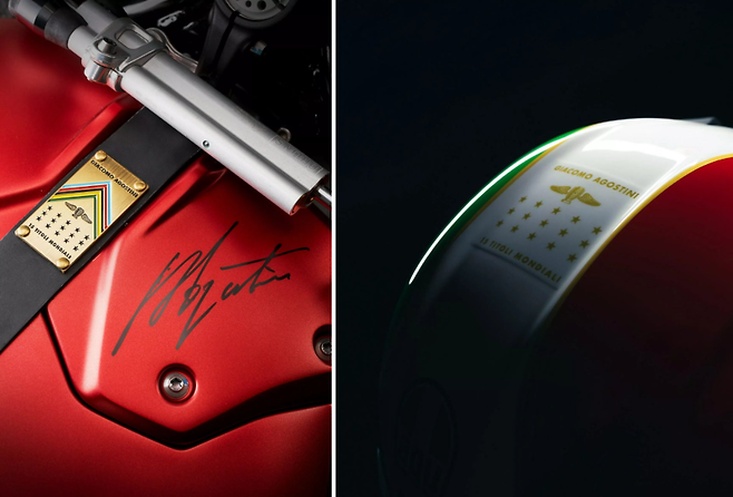 차체는 전면 카본 파이버 소재로 구성돼 무게를 최소화했다. 컬러는 아고스티니가 실제 경기에서 탔던 머신을 오마주한 무광 파이어 레드와 매그넘 실버 투톤으로 마감됐다. 이 밖에도 상징적인 노란색 숫자 ‘1’ 라운델이 측면에 부착됐으며, CNC 가공된 노란색 헤드라이트 테두리가 개성을 더한다.
