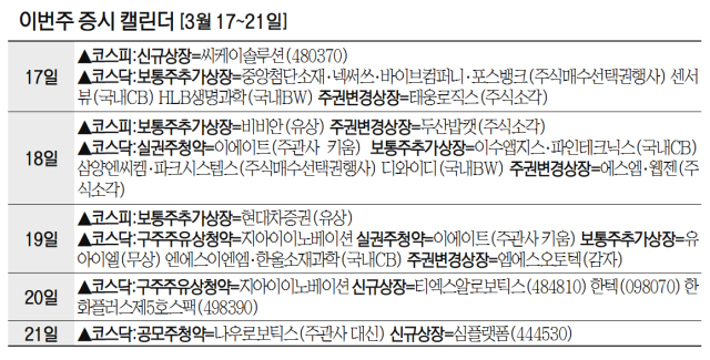 이번 주 기업공개(IPO) 시장에는 공모가를 상단으로 확정한 씨케이솔루션이 이번 주 유가증권시장에 상장한다. 20일에는 티엑스알로보틱스와 한텍이 코스닥 시장에 상장하며 21일에는 심플랫폼이 상장, 나우로보틱스가 공모주 청약에 돌입한다.