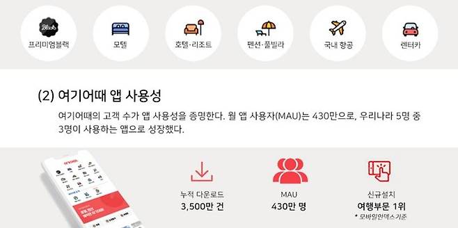 통상 글로벌 OTA의 거래액의 50% 가량이 '메타서치(가격 비교 사이트)'를 통해서 나온다고 볼 때, 여기어때 거래액의 97%가 앱에서 발생한다는 점은 주목할 만하다.