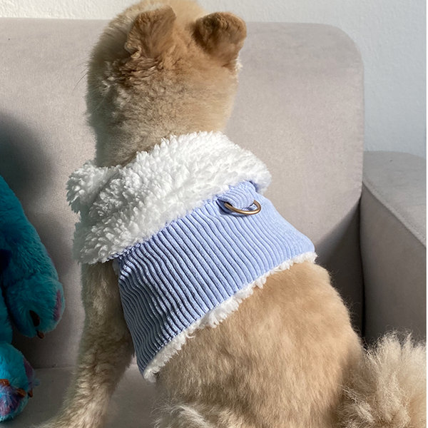 은은한 파스텔톤의 하늘색 컬러의 강아지 하네스입니다. 안감, 겉감 모두 따뜻한 소재이고 두께가 아주 두꺼운 편이라 겨울용 하네스로 좋아요. 이 제품의 경우 잠금장치가 가슴 앞 부분에 벨크로만 있어서 조금 아쉬워요.