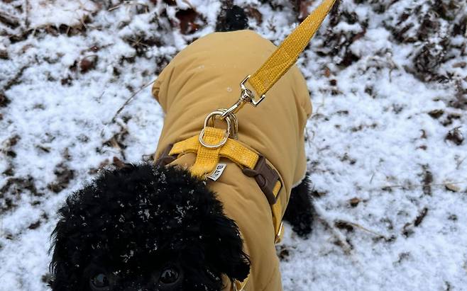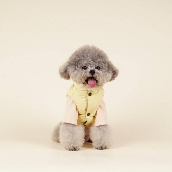 귀여운 강아지 패딩조끼로, 등 쪽에 하네스를 걸 수 있는 링이 있어 옷 겸 하네스로 활용할 수 있는 제품이에요. 안감도 부드러운 털로 되어 있어 따뜻합니다. 똑딱이 단추 세 개로 잠글 수 있지만, 확실히 하네스가 벗겨지지 않게 도와주는 버클이 없어 조금 아쉬워요.