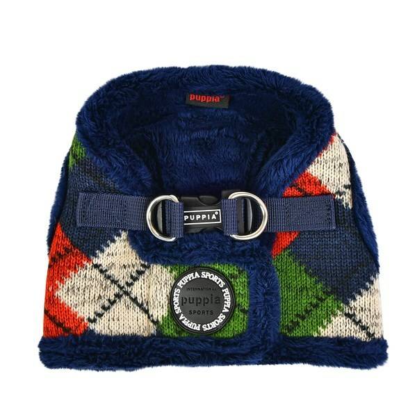예쁜 아가일 패턴의 도톰한 강아지 하네스입니다. 겉감은 니트, 안감은 털로 되어 있어 겨울용으로 딱 좋아요. 벨크로와 버클 두 가지 잠금장치가 있어 안전하기도 합니다.