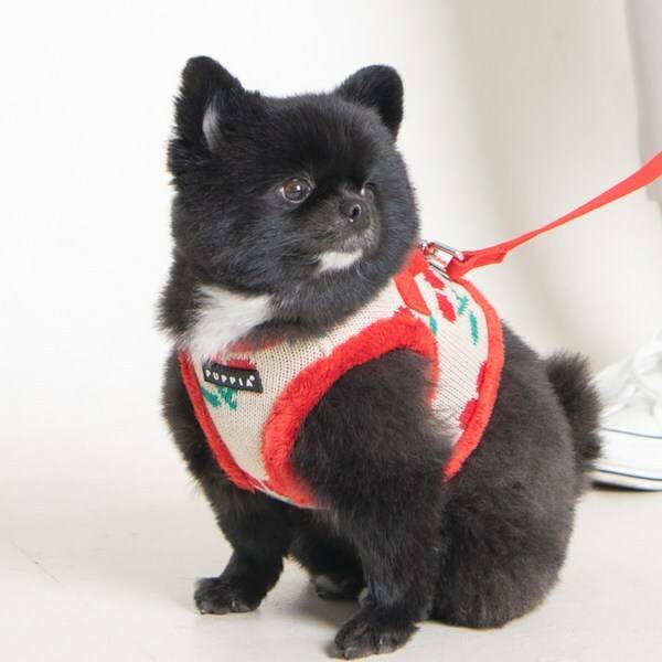 귀여운 앵두 패턴의 강아지 하네스입니다. 겉감은 니트, 안감은 털로 되어 있어 아주 따뜻해요. 부자재인 버클, 링 등이 아주 튼튼해 안전하게 산책할 수 있답니다.