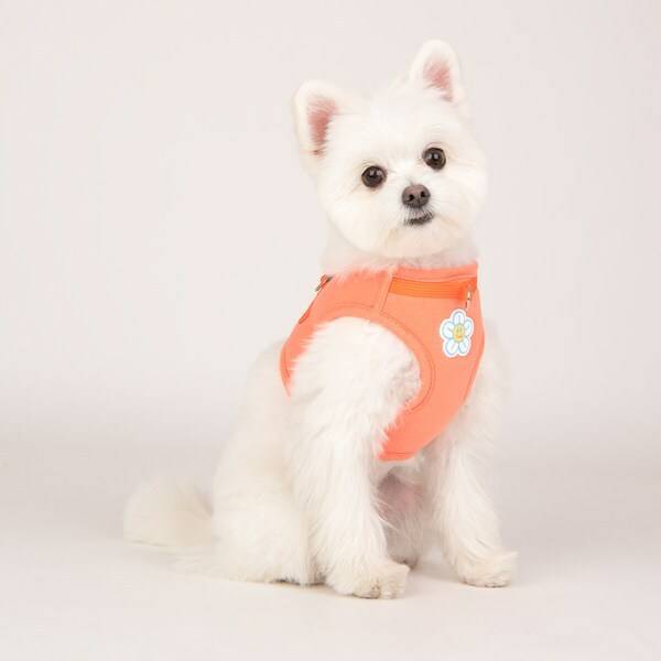귀여운 오렌지색에 꽃 모양 패치가 붙어 있는 강아지 하네스입니다. 에어매쉬 원단으로 여름철에도 사용하기 좋아요. 조끼형 하네스에 두툼한 소재라 착용감이 편한 제품이에요. 하네스 앞쪽에도 고리가 달려 있어 앞섬 방지 훈련용으로도 좋습니다.