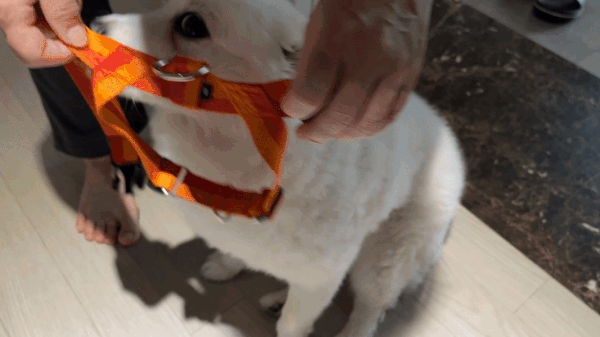 또한, 후크나 버클 같은 목줄의 부자재가 튼튼한지도 살펴봐야 합니다. 너무 약한 경우 산책 중 하네스가 풀리게 될 수 있어요. 버클을 채운 채 하네스를 잡아당겼을 때 쉽게 풀리지 않는지, 후크가 하네스에서 떨어질 일이 없는지 확인해 주세요.
