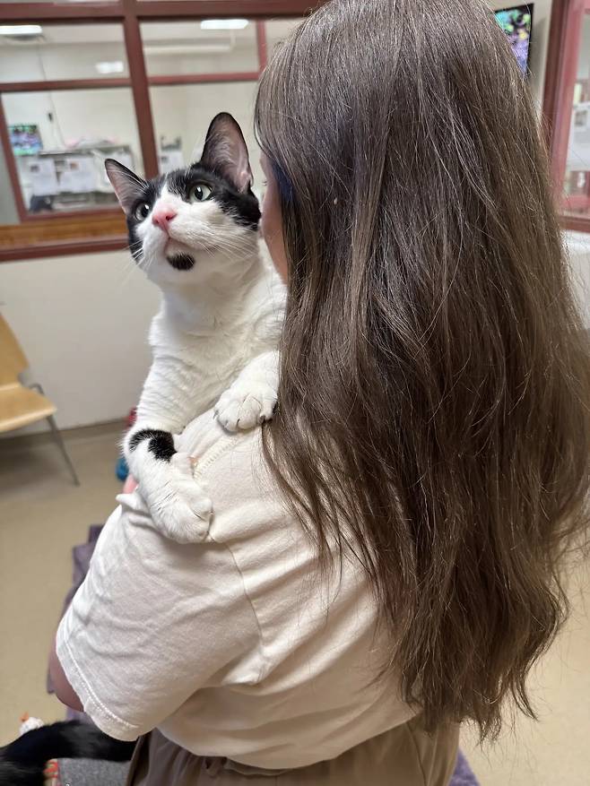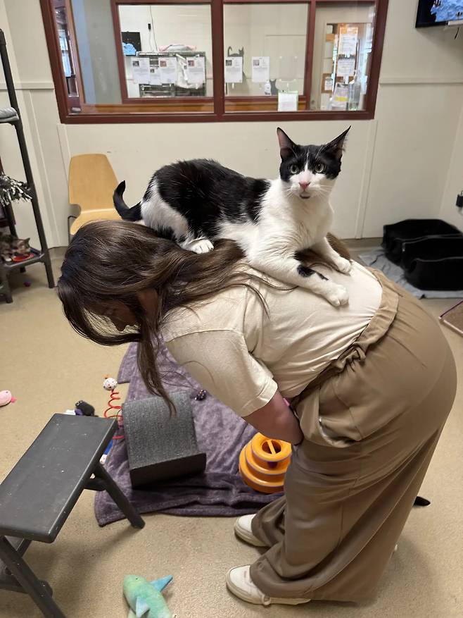 터커가 보호소에 도착하자마자, 직원들은 그에게서 뭔가를 발견했습니다. 터커가 다른 사람의 어깨에 앉거나 뛰어오르는 걸 너무 좋아한다는 것이었습니다.