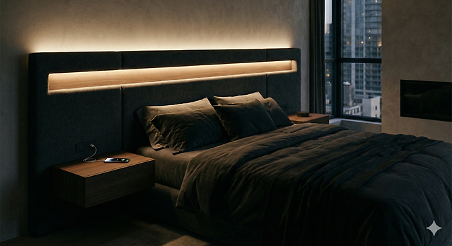 다만 무게가 있어 이사 시 번거롭고, 프레임 자체가 두꺼워 좁은 방에서는 존재감이 강할 수 있다. 패브릭 프레임은 푹신하고 포근한 느낌이라 코지 인테리어에 적합하지만 오염 관리에 신경 써야 한다. 좁은 신혼집이라면 철재 혹은 슬림 원목 헤드리스 프레임에 밝은 톤 침구를 조합하는 것이 가장 넓어 보이는 세팅이다. 여기에 침대 양옆 협탁 대신 벽선반을 설치하면 바닥 면적을 추가로 확보할 수 있다.