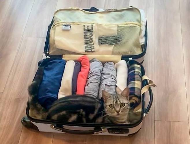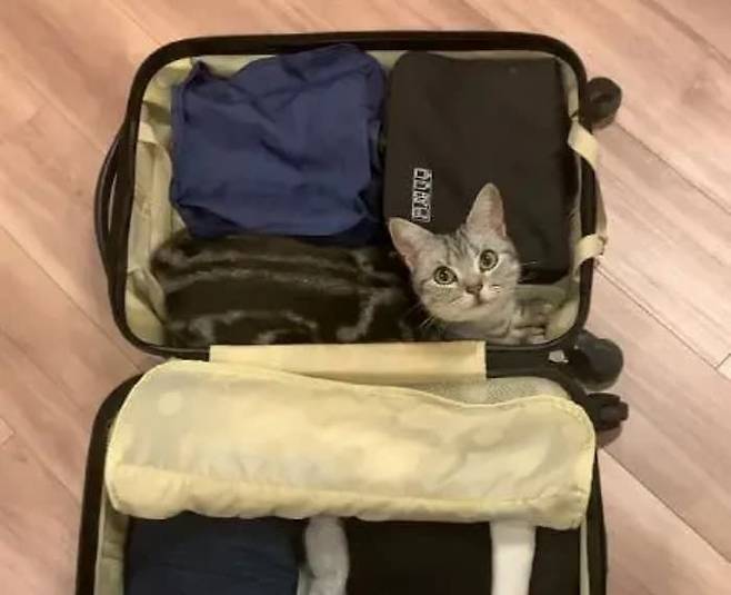 가족 여행 당일 아침에 찍은 것이라는 사진 속에는 집사의 캐리어 가방 한켠에 비어 있는 공간에 쏙 들어가 있는 고양이 모습이 담겨 있었습니다.