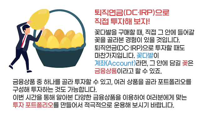 이번 시간에는 첫 단계로, 퇴직연금(DC∙IRP) 가입자가 투자할 수 있는 금융상품에 대해서 알아봤는데요. 다음 시간에는 두 번째 단계인 내게 맞는 투자 상품을 고를 때 점검해야 할 사항들에 대해 살펴보도록 하겠습니다.