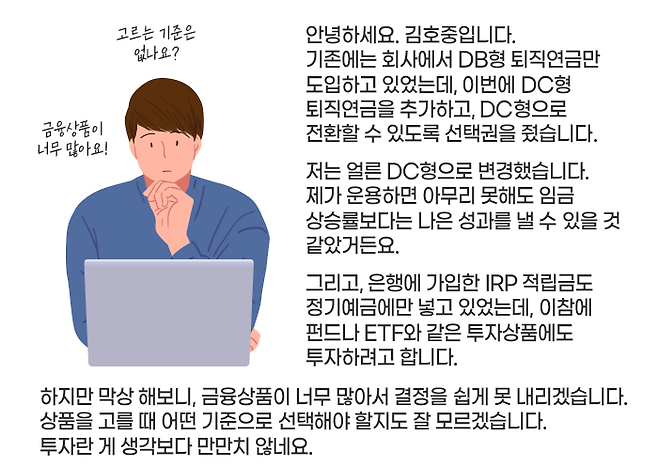 퇴직연금 가입자(DC∙IRP)가 선택할 수 있는 금융상품은 그 종류가 너무 많아서, 오히려 자신에게 맞는 상품을 선택하기가 쉽지 않습니다. 더욱이 퇴직연금은 노후 생활비의 중요한 재원이니, 투자로 인해 손실을 볼 수도 있다는 걱정도 크실 겁니다.