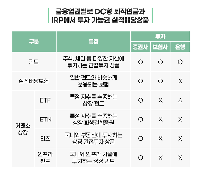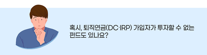 퇴직연금(DC∙IRP) 가입자는 공모 펀드와 국내 거래소에 상장된 ETF, ETN, 리츠에 투자할 수 있습니다.