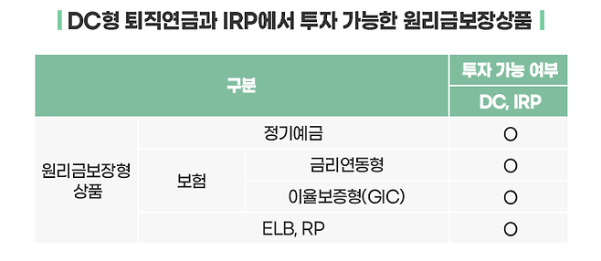 원금과 이자가 보장되는 원리금보장상품은 투자한도 제한 없이 적립금의 100%까지 투자가 가능하다는 특징이 있습니다.