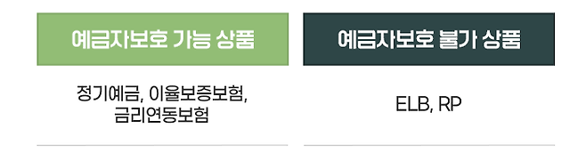 두 번째는 예금자보호 여부입니다. 정기예금, 이율보증보험, 금리연동보험은 예금자보호를 받을 수 있지만, ELB와 RP는 예금자보호 대상이 아닙니다.