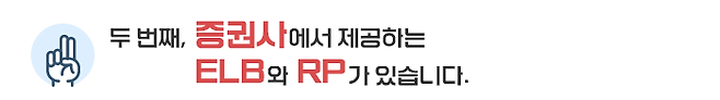ELB는 증권사 자신의 신용으로 발행하는 파생결합사채로, 주가지수나 개별 주식 등 기초자산의 수익률에 따라 사전에 약정된 수익이 결정되는 금융상품이고, RP는 일정 기간이 경과한 후 일정한 가격으로 동일 채권을 다시 매수하거나 매도하는 조건으로 채권을 매매하는 금융상품입니다.